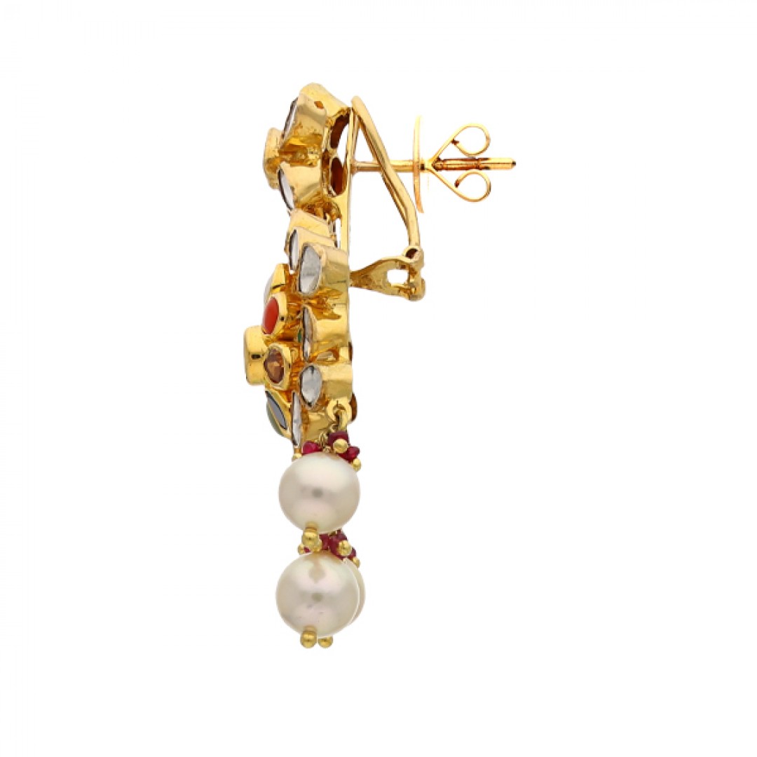 The glory of gold meets the elegant aristocracy of nine precious stones in this unique pair of floral chandelier earring. Enhance the opulence of traditional Indian festivities with this pair. Feel royalty each time you adorn this masterpiece.